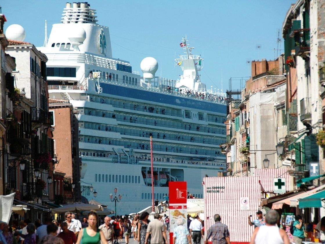On an average day, tens of thousands of passengers lean over the railings of cruise ships that can be 300 yards long and 15 stories high. The tourists peer down at the majestic Doge’s Palace as they sail into St. Mark’s basin and down the Giudecca canal.